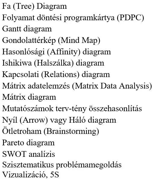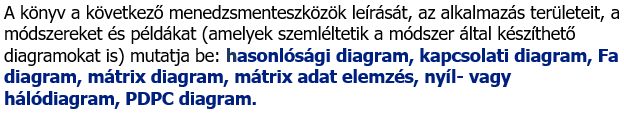 A Jaapán Tudósok és Mérnökök Egyesületéhez fűződő "7 új módszer", a Hasonlósági-,Kapcsolati-,a Fa-, a Mátrix-, a Háló- és PDPC diagramok bemutatása. Ár: 2500 Ft. További információ >